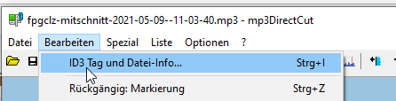 Nur für die Predigtaufnahme muss der Predigt-Titel, Name des Sprechers und weitere Infos eingegeben werden. Dazu wählt man Bearbeiten und ID3-Tag und Datei-Info: