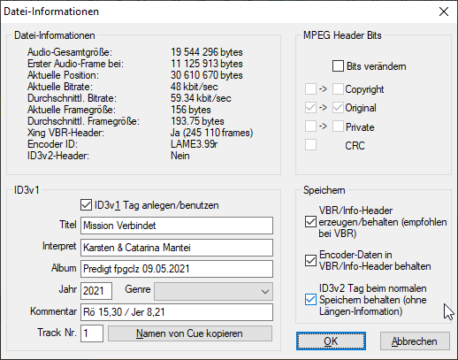 ID3v1 Tag erstellen/verwenden: Haken muss gesetzt sein.Titel: Eventuell muss man den Prediger danach fragen.Interpret: Name des Redners / der RednerinAlbum:Predigt KaO 07.07.2024(natürlich mit aktuellem Datum)Jahr: SelbsterklärendKommentar: Wenn die Predigt eine bestimmte Bibelstelle behandelte, kann sie hier angegeben werdenTrack Number: Hier schreiben wir eigentlich immer nur1rein.
