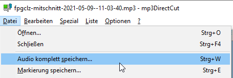 Zum Speichern der geschnittenen Datei wählt man Datei und Audio komplett speichern…