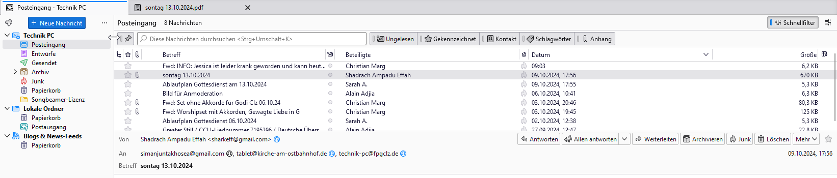1. Thunderbird - Mail, z.B. für Ablaufpläne oder sonstige Infos/Unterlagen, die an die ”technik-pc“-Email-Adresse geschickt wurden.