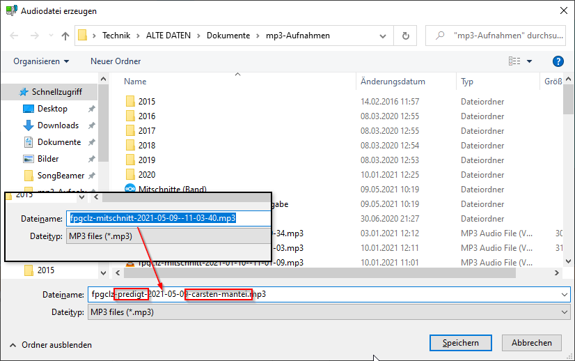 Der automatisch generierte Dateiname muss bei der Predigt abgeändert werden: