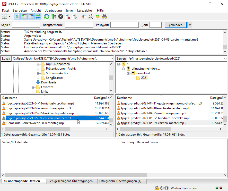 Zum Hochladen auf die Gemeinde-Webseite startet man FileZilla 5) und verbindet sich dort mit dem gespeicherten Bookmark FPGCLZ